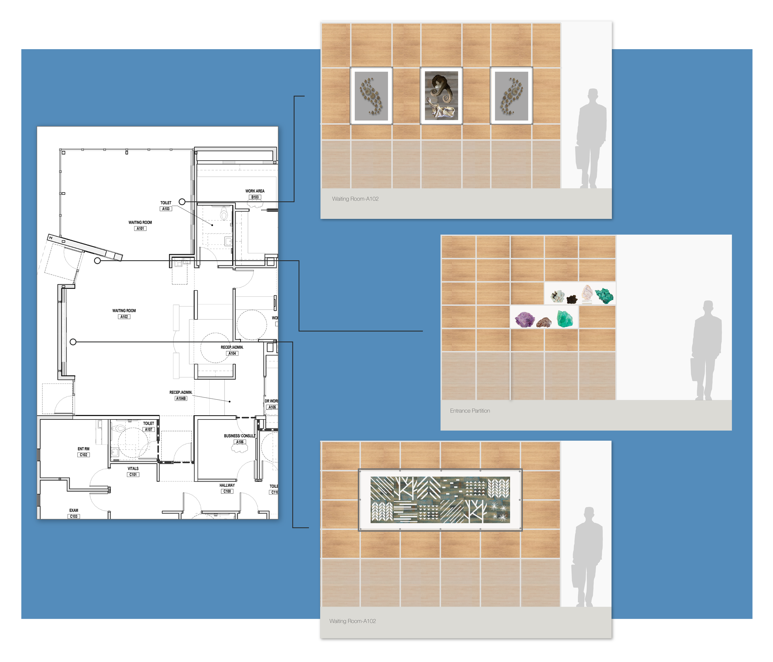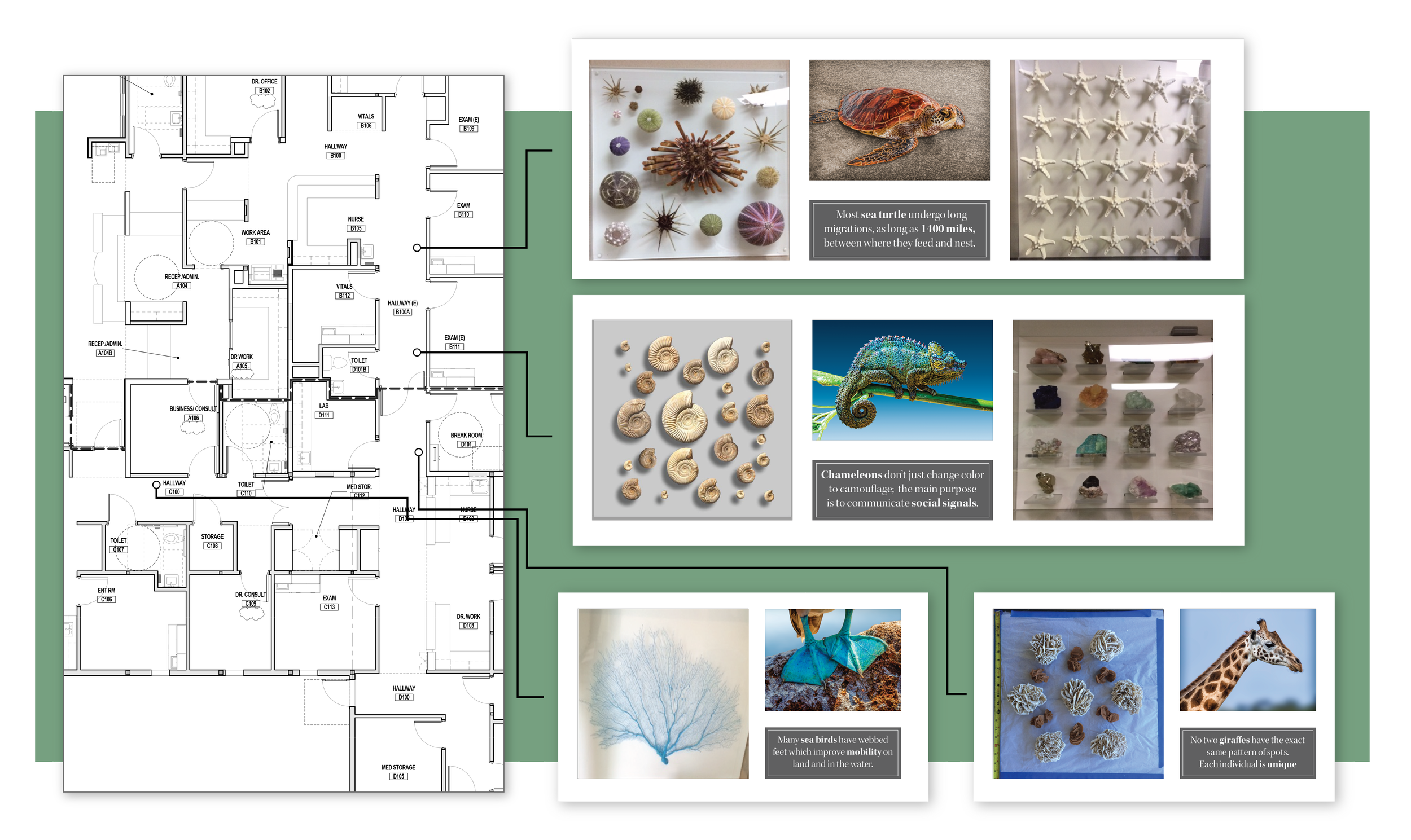 Waiting rooms are often dull, but what if they could spark curiosity instead? Inspired by Dr. Bustamante’s passion for natural history, I created three large-scale art installations that turn idle moments into a journey of discovery.